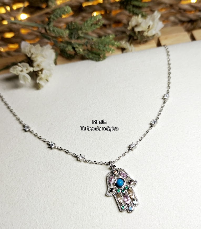 Material: Cadena de Plata de Ley 925 con 6 Circonitas blancas. Mano de Fátima con Turquesa y Circonitas de colores ámbar, blanco, rosa, champagne y verde.