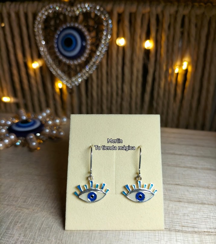 Esmaltados en blanco y azul, estos pendientes talismán con forma de ojo resaltan sus amplias pestañas con la intención de captar mejor las malas miradas, la envidia y el mal de ojo que se dirijan hacia quien lo lleve.