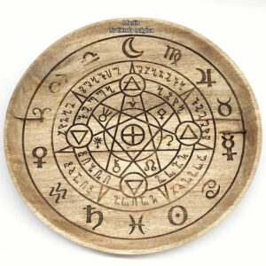 Plato de madera con símbolos esotéricos de los Elementos, de Astrología y el Alfabeto de las Brujas. Cada signo está impregnado de antiguos secretos y poder protector.