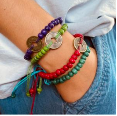 Preciosas pulseras de buena suerte de Feng Shui hechas de cuentas de madera y monedas de la Fortuna.